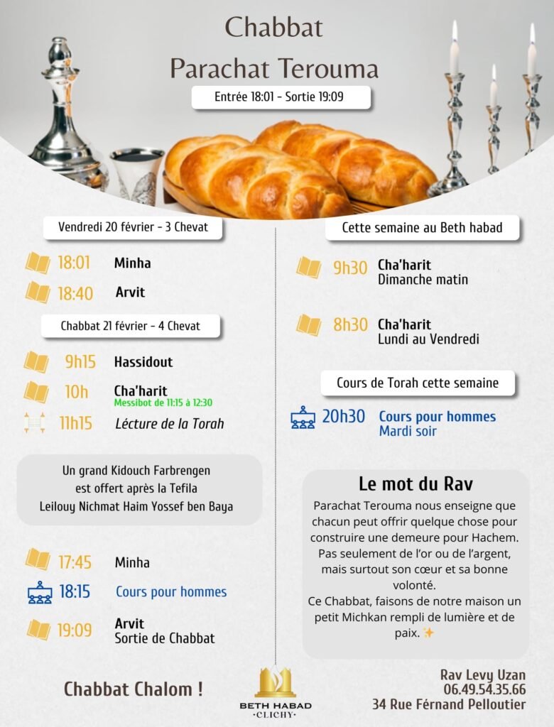HORAIRES DE CHABBAT TEROUMA A CLICHY