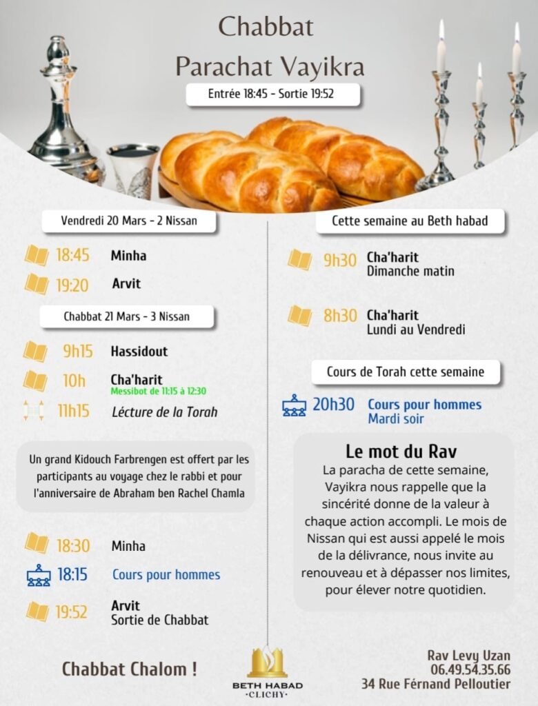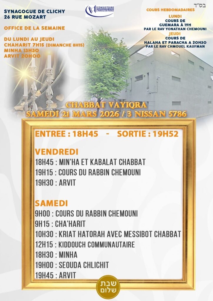 Chaque semaine retrouvez les horaires de chabbat à Clichy avec le programme … 😃