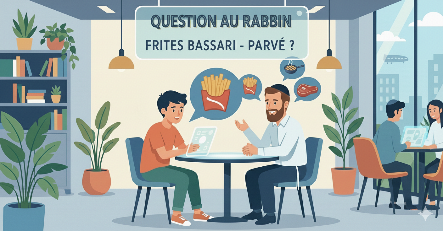 Cependant, si vous vĂ©rifiez la rĂ©alitĂ© sur place et que vous avez la certitude absolue que les frites ont Ă©tĂ© frites dans un autre endroit, dans une autre piĂšce, et avec des ustensiles diffĂ©rents et sĂ©parĂ©s de l’endroit oĂč l’on frit les schnitzels ou l’on prĂ©pare le chawarma, alors dans ce cas prĂ©cis, les frites sont ParvĂ© et ne sont pas dĂ©finies comme carnĂ©es.